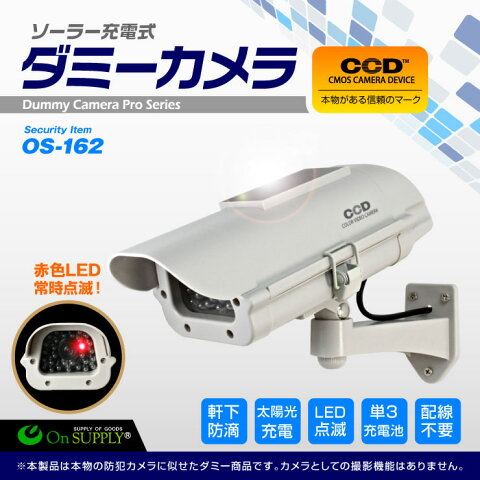 6)他の「万引防止ステッカー」シリーズとの組合せでさらに効果アップ!◆ダミーカメラ(OS-162) 【材質】 ABS樹脂 【カラー】 アイボリー 【本体サイズ】 約210×93×80mm 【ブラケットサイズ】 約145×52×80mm 【重量】 約343g(ブラケット含) 【レンズ】 プラスチック 【電源】 ソーラー(単3形ニッケル水素充電池×2・付属)※ソーラーパネルを介して充電されます。